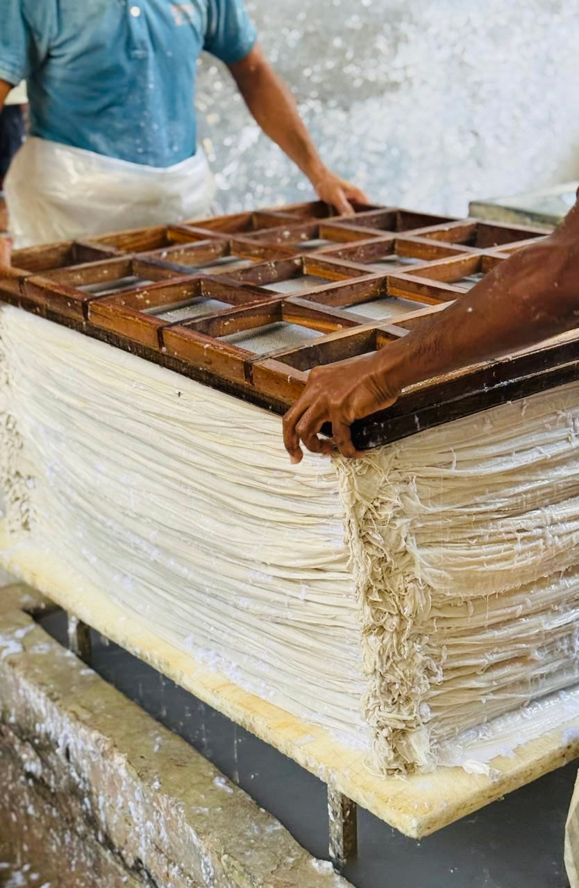 Cotton is cleaned, soaked and beaten into a smooth pulp. Artisans dip wooden moulds into this pulp to form each sheet, giving it a naturally soft texture and signature deckled edges.