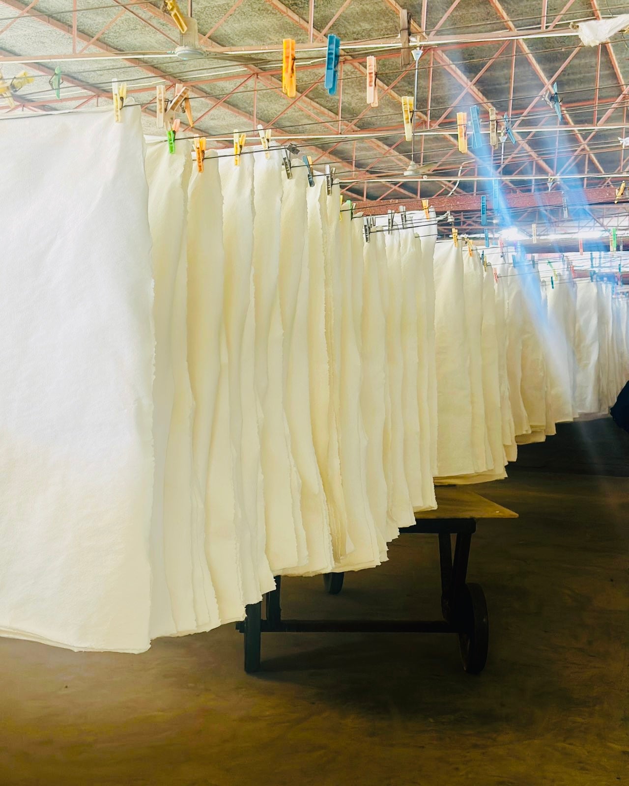 Each sheet is lifted and hung to dry in open air. This slow, natural drying process keeps the paper durable, flexible and beautifully organic.